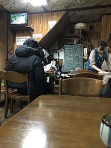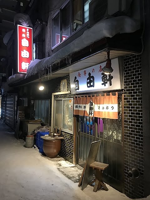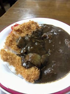 這天因為住在離自由軒走路只要不到十分鐘距離的地方,於是等到人比較沒那麼多的八點多才過去吃,出門之前,旅館櫃檯也跟我說了這家很棒,不過他倒不是推薦大家來朝聖的五郎套餐,相反的推薦我可以試試豬排咖哩,進到店裡,正好還有個位置,不過是跟一個日本人併桌,這個日本人也是來朝聖的,他點了五郎套餐,上菜時他還很不好意思的拿起手機尷尬的拍了幾張照片才開動,我坐他對面也是笑笑的,然後自己也裝逼的拍了張餐廳內部跟我的豬排咖哩,這家店其實不大,當我點完餐後,來了九個台灣人,但因為空間限制,他們被迫拆開坐,看他們不會講日文的同伴在跟老闆雞同鴨講,我也替他們感到悲傷~