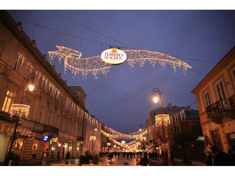 12月的華沙,大概四點左右就天黑了,所以趁天還沒黑之前就趕快從溫暖的公寓離開,然後搭車去華沙古城附近,在地鐵M2站下車後,沿著金莎大街往古城走,這一路上就都是裝飾得很有氣氛的聖誕燈飾了,不過之所以說這條是金莎大街,其實是因為這條的裝飾上頭很多FERRERO ROCHER的標誌,相信這應該是金莎公司出錢裝飾的吧,在這個市集有幾個不錯的表演活動,還有免費的節日活動照拍攝,拍完還送你一張帶回家留作紀念,然後又有免費的熱茶,這在歐洲樣樣都是使用者付費的區域可是非常難得~